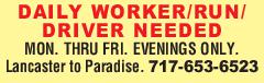 DAILY WORKER/RUN/ DRIVER NEEDED MON.