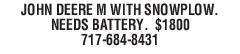 JOHN DEERE M WITH SNOWPLOW. NEEDS BA
